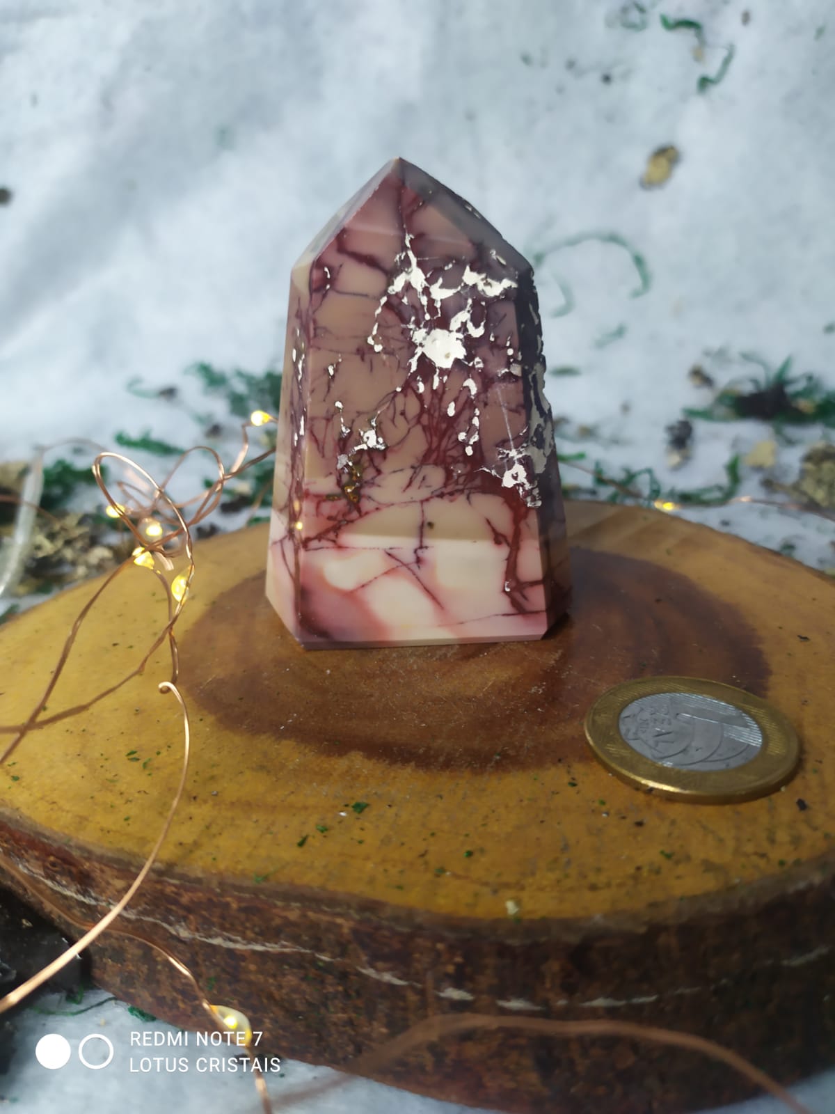 Imagine segurar em suas mãos uma ponta de cristal gerador de jaspe mokaita. Observe as nuances de vermelho, marrom e amarelo que dançam em sua superfície, como pinceladas de uma obra de arte natural. Sinta sua textura suave e reconfortante, como se estivesse segurando um pedacinho da natureza em suas mãos.