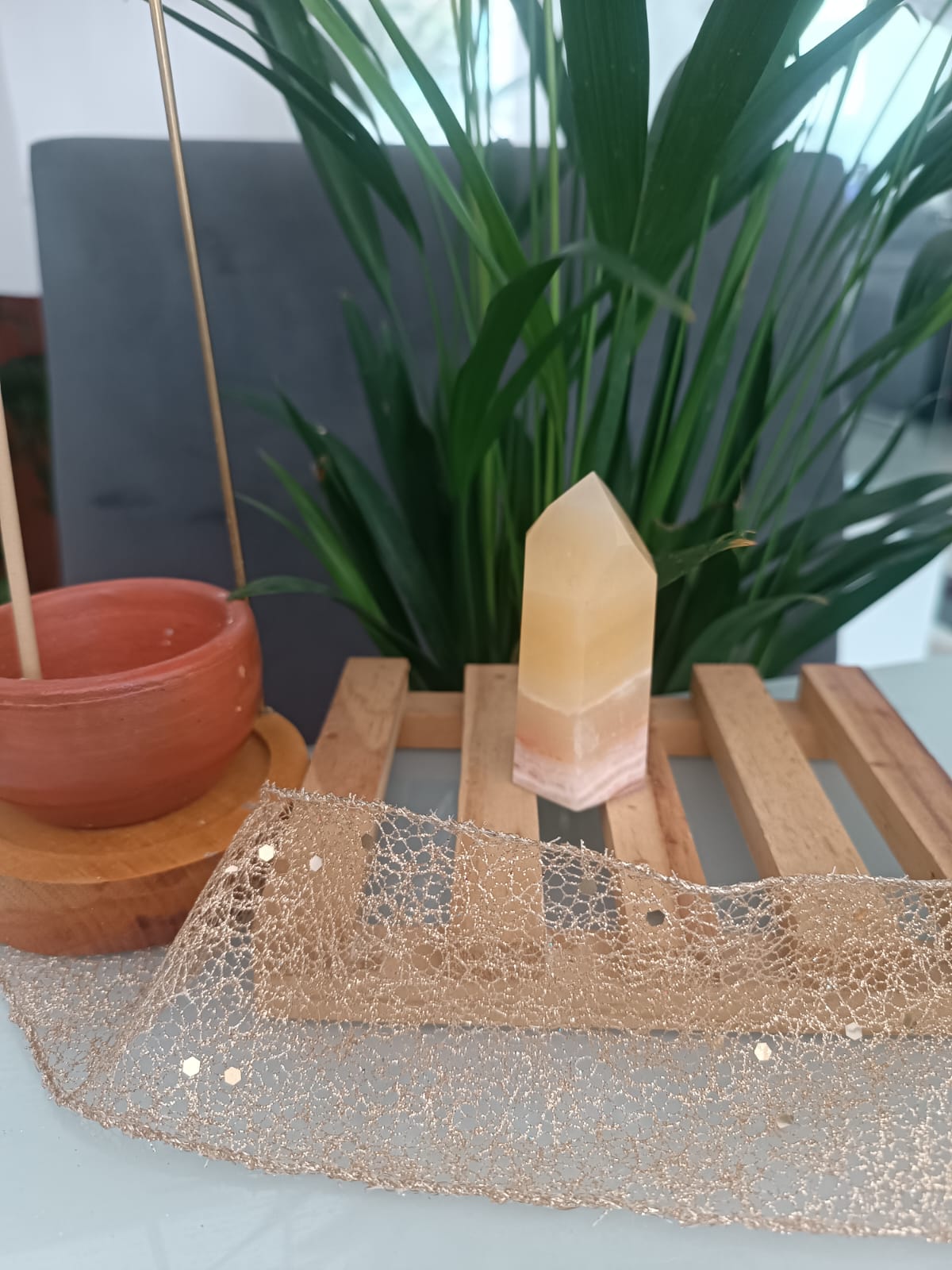 A ponta atua como um canalizador energético, irradiando e direcionando a vibração da calcita para o ambiente e para quem está próximo.